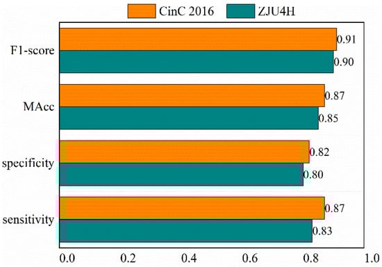 Figure 6 shows the performance of Net_3 with the setting of the class weight under two test sets, CinC 2016 and ZJU4H. The model provided a MAcc of 0.85, with a sensitivity of 0.83 and specificity of 0.80. The F1-score of the model was found to be 0.90. The performance of the two test sets was similar to Net_3 with the setting of the class weight. This proves that Net_3 with the setting of the class weight has good versatility.