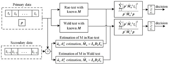 Over the past few decades, there has been more and more attention in the field of detecting range-spread targets adaptively in the presence of disturbance which is described by unknown covariance matrix [1,2,3]. The point-like target model is invalid with the extensively application of the high resolution radars (HRRs), which have the ability to resolve a target into multiple scattering centers appearing into different range cells [4]. Based on relevant theories of the generalized likelihood ratio test (GLRT), adaptive detectors have been developed specially for range-spread targets in recent last decades [2,5], which estimate all the unidentified parameters separately under each hypothesis. Moreover, the design of the detectors have absorbed relevant theories of the Rao and Wald tests, which not only perform with less complexity and stronger robustness than the GLRT, but also have the same asymptotic performance as the latter [6]. Specifically, by applying theories of the Rao test and Wald test, related scholars have successfully proposed constant false-alarm rate (CFAR) detectors in the case of homogeneous scenarios [7], where the disturbance covariance matrices of range cells under test are entirely identical to those of training data. In [8,9], the disturbance respectively described as a spherically invariant random process (SIRP) as well as complex Gaussian distribution are taken into consideration. In [10], the problem of adaptively detecting multichannel signal in homogeneous Gaussian disturbance and the generalization of the generalized multivariate analysis of variance (GMANOVA) are thoroughly researched. Additionally, similar works of adaptive detection of subspace signals are also considered [11,12].