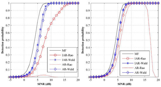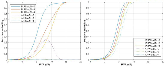 In Figure 5 (left), we have plotted the detection curves of the conventional AR-Rao detector and the newly derived IAR-Rao detector. It can be seen that the collapse loss exists under high SINR is vanished by the method of two-step detector design. All the curves in Figure 5 indicate that both AR-Rao and AR-Wald achieve improved detection performance by means of matrix reconstruction. Moreover, the detection performance deteriorates with the increase of M for each detector, which is so-called order mismatched.