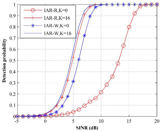 In Figure 3, we abbreviate “IAR-Rao” as “IAR-R” and “IAR-Wald” as “IAR-W”. It can be seen that the IAR-Wald detector can still achieve good detection performance under the circumstance of insufficient data for training, which is in agreement with that of AR-Rao detector. Figure 3 directly shows the AR-Rao detector performance decreases under high SNR. This is because Rao test uses both the primary and the training data to estimate the covariance matrix of the clutter. When the SINR is large, the signal is to influence and contaminate the estimated value of the clutter covariance matrix. The mentioned phenomenon does not exist in the newly derived IAR-Rao algorithm.