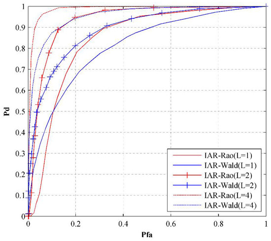 Figure 4 provides a display of the receiver operating characteristic (ROC) of the newly derived detectors, which is depicted respectively for various numbers of target scatterers L, while we keep and SINR = 5 dB. By the comprehensive observation of the figure, it is clear to conclude that the performance of the proposed detection methods will grow when the L value increases. To put it differently, the detectors’ performance is capable of being improved by increasing the radar resolution. Obviously, the IAR-Wald outperforms IAR-Rao in the realistic detection environment (low ); However, it has a heavy computation compared to the latter.
