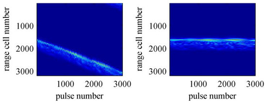 For evaluating the performance of the two new detectors, we complete a further assessment using the high-resolution range profiles (HRRPs) gathered from the actual data of Tiangong-1, which are collected from the measurement of inverse synthesis aperture radar (ISAR). Figure 6 (left) gives a display of the original echo data, which demonstrates that range migration would occur in moving targets scenarios. Firstly, envelope alignment and self-focusing are needed to eliminate the influence of target translation. Then the IAR-Rao detector and the IAR-Wald detector are used to detect the processed data. Figure 6b shows the aligned echo. Additionally, we set as the target occupies 67 range cells.