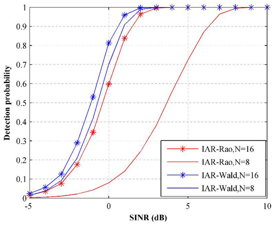 The versus SINR of the newly derived IAR-Rao and IAR-Wald are plotted in Figure 2 comparing with AR-Rao and AR-Wald. Additionally, the detection probability curve of the ideal matched filter (MF) is also drawn in Figure 2. Although the MF cannot be achieved in a realistic scenario, it provides a baseline comparison. It is quite evident that the IAR-Rao outperforms AR-Rao and IAR-Wald outperforms AR-Wald especially at high SINR. That is because the traditional methods of AR detectors discard samples of which the number is equivalent to the autoregressive order P. When the pulse number N becomes larger, the traditional AR detectors become very close to the IAR detectors. This phenomenon is caused by the truth that the number of the discarded pluses (P) can be ignored as N increases. For all of AR and the IAR detectors, there are always a performance loss compared with the MF, which can be explained as the estimated covariance matrices ( and ) are always inaccurate when compared with its true value ().