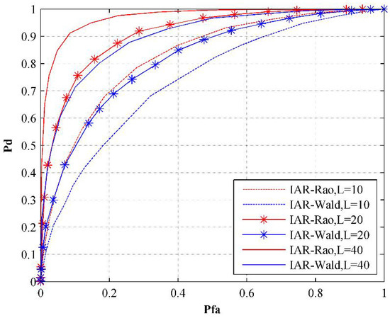 of the IAR-Rao and of the IAR-Wald under conditions of , , SINR = 5 dB and various L.