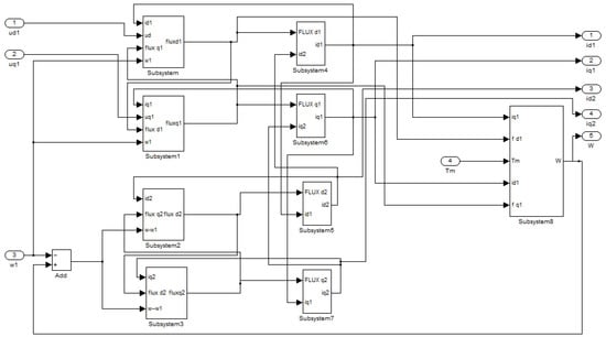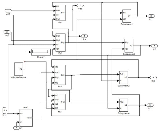The Simulink model of an induction motor including its stator and rotor faults can be represented as shown in Figure 2, Figure 3, Figure 4, Figure 5, Figure 6, Figure 7, Figure 8, Figure 9 and Figure 10. Figure 2 represents a healthy induction motor. While Figure 3 and Figure 4 represent a motor with the fault in its stator and rotor, respectively, where its inputs are , , , and . Figure 3 expands the block diagram of Figure 2. Figure 2 is divided into five blocks: The first two blocks represent converting three phase voltages to d-q axis frame voltage; the main block in this figure is the three-phase induction motor in d-q axis, where the implementation of this block depends on the above equations (Equations (2)–(10)), while the last two blocks represent converting motor’s current from d-q current axis frame to current in three phase , , and .