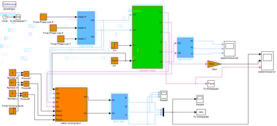 The Simulink model of an induction motor with faults in its stator can be implemented in MATLAB Simulink, as shown in Figure 4. This figure represents the MATLAB Simulink implementation of inter-turn stator faults block. Figure 5 shows the sub-block of the stator faults, which is implemented based on Equations (11)–(13), while Figure 4 represents a healthy induction motor, as shown in Figure 2. Adding the inter-turn stator fault block, which is implemented in Figure 5, has been performed according to Equation (14), where Equation (14) represents the normal stator current combined with current that results from a stator’s fault. The Simulink model of the induction motor with rotor faults can be implemented in MATLAB Simulink, as shown in Figure 6. Like stator faults, rotor faults can be implemented according to Equation (18), which represent rotor faults and then added to the system provided in Figure 2.