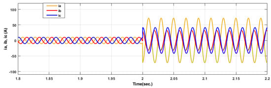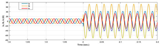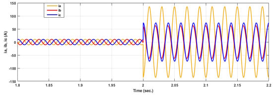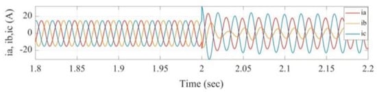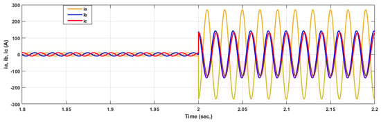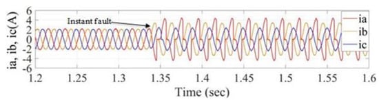 Figure 25 shows the no-load scenario of the motor with a 25% inter-turn fault in phase (a) as its fault condition. As shown in Figure 25, the current values of phase-a and phase-b have been increased and harmonic has also appeared on the current signals.