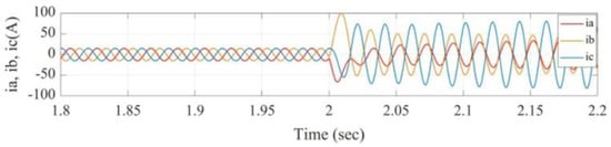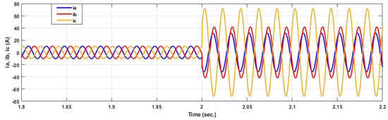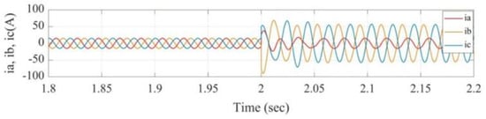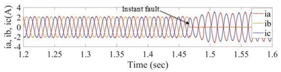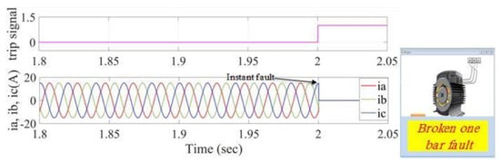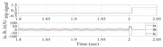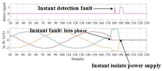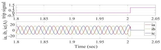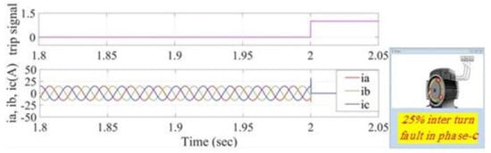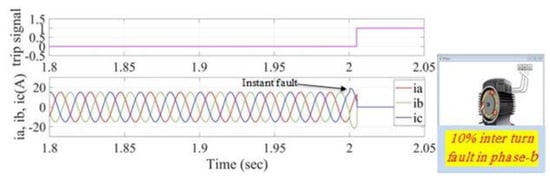 The simulation results for the application of the proposed method when it uses its non-overlapping window frame are shown in Figure 19 and Figure 20, where these figures show the stator current before and after the instant fault is being induced and before and after the activation of the trip signal. Figure 19 shows the current signals before and after isolating the supply after a trip signal has been initiated by making a 10% short circuit in phase-b, and in Figure 20, the induced fault is 25% in phase b and 10% in phase a. In both cases, the trip signal has a delay of 64 samples, because the fault cannot be detected in the first 64 samples.
