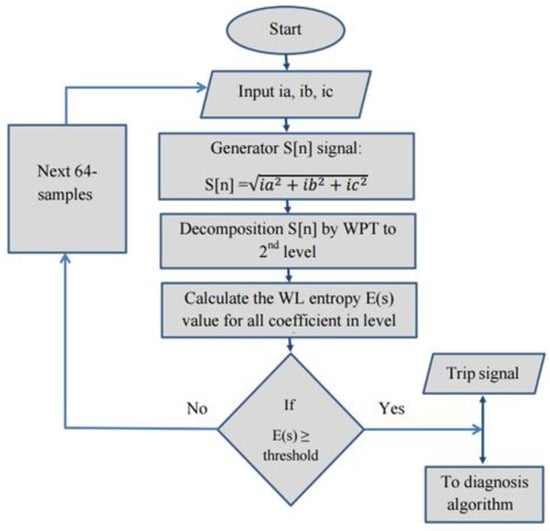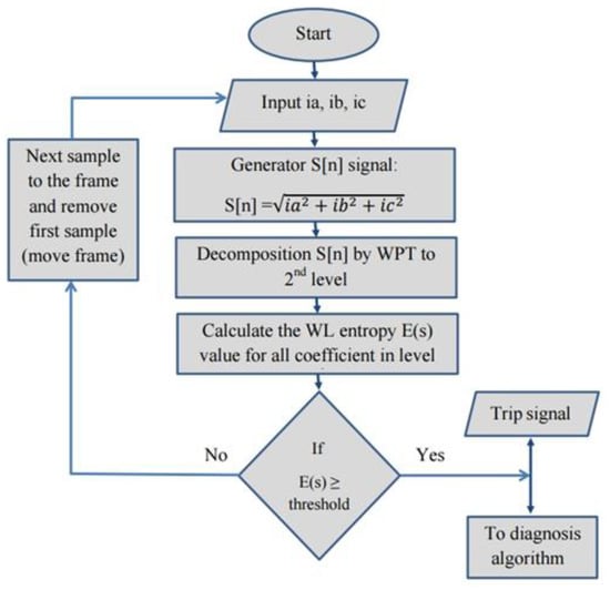 If the proposed method detects a fault in the induction motor, it activates a trip signal, which is sent to the circuit breaker of the motor to disconnect the motor from its power supply, and an alarm window will be activated on the PC screen. The proposed algorithm is then moved to its next stage to classify the type of electrical fault in the induction motor. The diagnosis algorithm’s block diagram is shown in Figure 13.