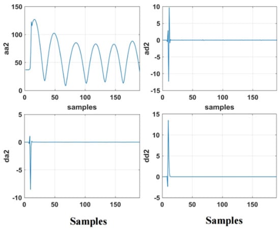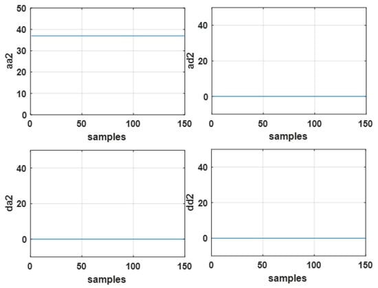 The three current signals of the motor stator, , are combined to generate a single current signal called S by computing their root mean square value. The resulting current signal, S, is then sampled at sampling rate of 12.8 kHZ, generating a discrete signal, which is used for fault detection and recognition. The proposed method then takes 64 samples of the resulting signal in each of its processing stages using either of its window frame sampling methods, as explained in the previous section. It then applies two level WPT on the window samples, decomposes the window samples to their wavelet subbands using ‘sym5’ mother wavelet, and generates four wavelet subbands called aa2, ad2, da2, and dd2. The wavelet energies for the samples of a healthy and a faulty induction motor are shown in Figure 14 and Figure 15, respectively. The proposed method uses the total energy value of all coefficients in the second level of the WPT subbands as a feature for fault detection and diagnosis in the induction motor.