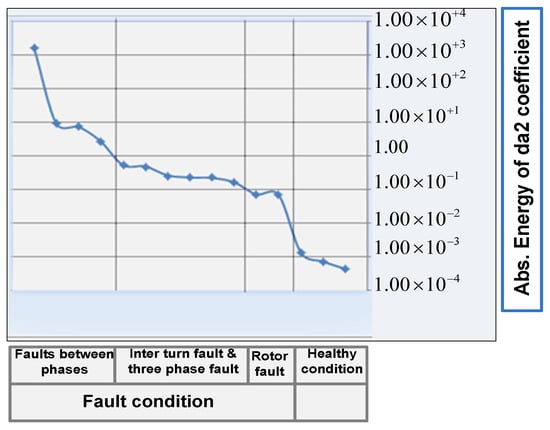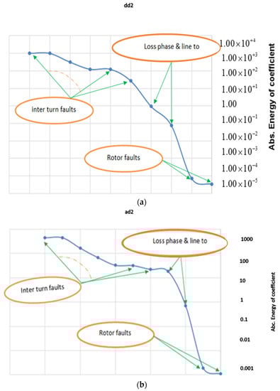The entropy power energy curves for WPT dd2− and ad2 subband’s coefficients are shown in Figure 17a,b. In these, the range of EE values linked to different motor faults has been annotated on the curves.