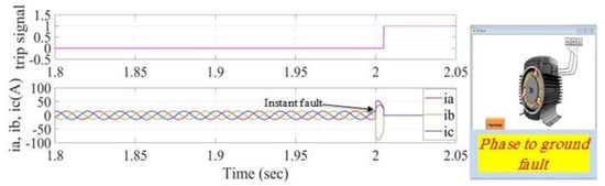 The simulation results for the application of the proposed method when it uses its moving window frame are shown in Figure 21 and Figure 22, where these figures show the stator current before and after the instant fault is being induced and before and after the activation of the trip signal.