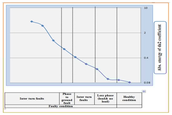 As shown in Figure 14 and Figure 15, the energy values for a health condition are equal to zero in all WPT high frequency subbands, ad2, da2, and dd2, while aa2 subband has a constant value, which is proportional to the energy conversion rate of the motor. It is common knowledge that aa2, the approximation subband, provides an approximation representation of the motor total current, and theWPT high frequency subbands, ad2, da2 and dd2, demonstrate the ac behavior of the current signal. In a healthy motor, the energy in its high frequency subbands is low. However, faults in an induction motor results in fluctuation in its current signal, which can be monitored and assessed using the information in its current WPT high frequency subbands’ signal. Empirical investigation in this research showed that the EE value of the da2 subband can be used to detect and classify the fault within the motor. As the information in this WPT subband demonstrates the ac behavior of the motor total current signal, the combined current signal is first smoothed by filtering the input current using the WPT low-pass filter and then its high-frequency components are extracted by passing the smoothed signal via the wavelet high-pass filter. Several empirical threshold values are determined to identify the type of fault in the motor using information presented in Figure 16. Experimental results show that the EE value in the da2 WP subband has a direct link with the type of the fault in the motor as follows: a) A healthy induction motor has a small EE value of almost zero; b) when a fault occurs in the motor’s rotor, the effect of this fault on the current signal will create an EE value higher than zero; and c) when the stator is faulty, the EE value will be higher than the EE value of the motor with a fault in its rotor, and as the number of faulty coils increase, the EE value of the da2 signal is increased too.