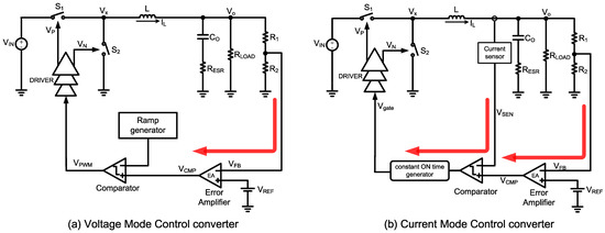In the existing control schemes of the buck converter, it can be roughly divided into two control modes: voltage mode control (VMC) [11] and current mode control (CMC) [12,13,14,15]. Figure 1 shows the structures of these control modes. From Figure 1, we can find that the difference between the two modes lies in the feedback path. Since the CMC has more of a feedback path than the VMC, the CMC should give a good performance in regard to the transient response and the voltage regulation. Therefore, the CMC technology is widely used in power conversion technology.