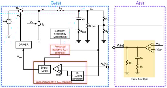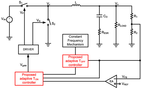 Figure 2 shows the proposed control topology. It uses the dual controllers to regulate the output voltage and the switching frequency. The “proposed adaptive TOFF controller” keeps the switching frequency constant, and the “proposed adaptive TON controller” regulates the output voltage. This topology does not require a current sensor to detect the inductor current actually. The states of switches S1 and S2 are non-overlapping and complementary.