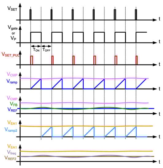 The implementation of the proposed converter is shown in Figure 3. From Figure 3, the realization of the controllers is effortless and suitable for PMIC. In addition, the “constant frequency mechanism” module is realized by referring [31]. For different applications, VO can be designed to the required value by adjusting the VREF in Figure 3. Furthermore, the switching frequency of the converter can also be adjusted by VREF2. Therefore, such a scheme is very flexible in the design. The operation of the converter in Figure 3 can be listed as follows: