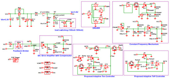 The SIMPLIS schematic of the proposed converter was built and is shown in Figure 6. For well mapping to Figure 3, the SIMPLIS schematic is grouped by the function module, and annotated on it. For example, the “Constant Frequency Mechanism”, “Proposed Adaptive TON Controller”, “Proposed Adaptive TOFF Controller,” and “DRIVER” modules are all clearly illustrated and annotated in Figure 6.