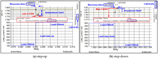 In Figure 7, the step-up and step-down recovery times of the load current transition are 1.5 μs and 0.9 μs, respectively. Therefore, the recovery time of the proposed converter is less than 1.5 μs. In addition, the specifications of the overshoot and undershoot voltage are measured as 16 mV and 12 mV, respectively, both within the range of 16 mV.