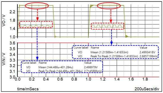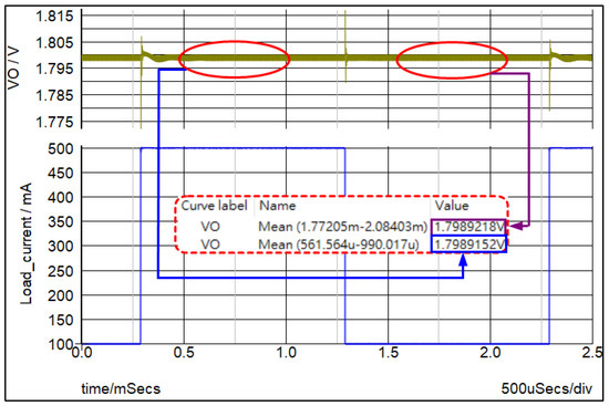 The load regulation follows Equation (5). This specification indicates the output regulation capability when the load changes. In application, the load regulation should be as small as possible. Similar to [30,31], the simulation conditions are set as follows: The input/output voltages are 3.3 V/1.8 V. The load current varies from 0.5 A to 0.1 A. As shown in Figure 9, the load regulation is 0.04% through Equation (5).