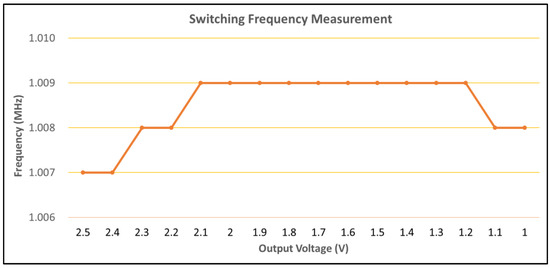 The Figure 10 shows the switching frequency of the different output voltages. From the simulation results in Figure 10, the switching frequency can maintain about the frequency of 1 MHz under different output voltages.