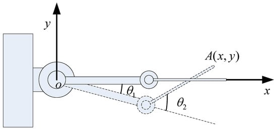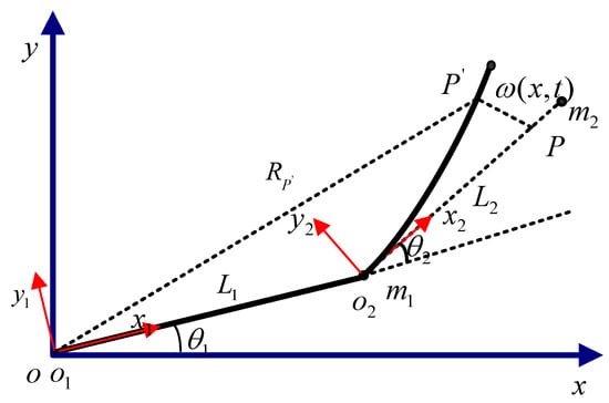 In Figure 1, - represents the inertial coordinate frame, and - and - are the moving coordinate frames with origin at the hubs of links 1 and 2, respectively. In addition, is the mass of the second hubs, is the mass of the tip load, and are respectively the revolving angles of the two links with respect to their frames, and are respectively the length of the two links, is the transverse elastic displacement, and is a spatial vector along with . According to the results obtained in [], the low-dimensional approximation model of the rigid-flexible manipulators system (cf. Figure 1) can be obtained.