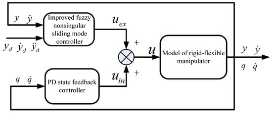 Because the rigid arm system is a minimum phase system, the asymptotic stability of the system can be guaranteed when the closed-loop control system is developed, so that the end trajectory of the system can be more easily determined. The determination of the end trajectory of the flexible arm is much more complex. The difficulty is that it is a non-minimum phase system. An important difference between a flexible arm and a rigid arm depends on whether there are internal dynamics. In the case of flexible arm movement, if the flexible deformation vibration is not suppressed, the internal dynamics of the manipulator become unstable. In the case of feedforward control, the instability of internal dynamics can easily lead to the divergence of calculated torque []. If feedback control is used, it leads to the instability of the closed-loop system. Due to the need to consider the characteristics of the dynamic model of the rigid-flexible manipulator system, there may be changes in the structural parameters, environmental changes, and component aging during operation. In the controller design, the designed output of the input-output subsystem should first follow the given trajectory. In addition, in order to ensure the stability of the internal dynamic subsystem, the following control structure (cf. Figure 2) is then proposed: