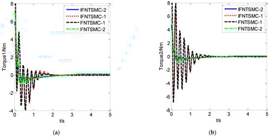 Input torque of the controller. (a) Input torque of joint 1, (b) Input torque of joint 2.