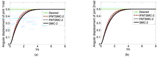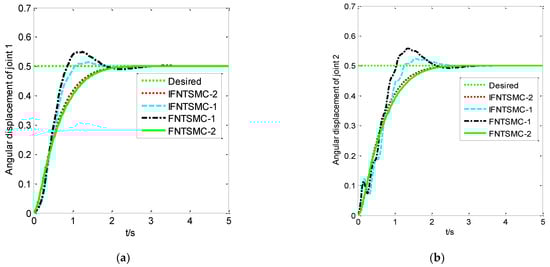 The joint angular displacement. (a) Angular displacement of joint 1, (b) Angular displacement of joint 2.