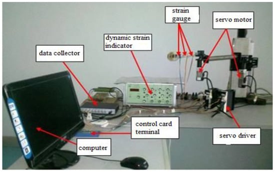 Figure 6 presents the real figure model validation experiment platform, including joint 1, which is driven by the step motor and ball screw transmission, and installed in the guideway grating ruler of the mobile position measurement, and joint 2 and joint 3, which are driven by a servo motor and reducer. The servo motor end has an installed incremental code that can collect the motor movement. The angle is computed in real time. The deformation of the flexible arm of the manipulator can be obtained by collecting the deformation data with a dynamic strain gauge; therefore, the accurate position of the end can be obtained. The main parameters of the test bench are shown in Table 2 and Table 3.