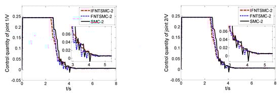 It can be seen from Figure 8, Figure 9 and Figure 10 that the improved fuzzy non-singular terminal sliding mode control (IFNTSMC-2) has the most stable control amount, compared with the fuzzy non-singular terminal sliding mode control (FNTSMC-2) and sliding mode control (SMC-2), so that the motion is relatively stable, the deformation of the end is relatively small, and the response of joints 1 and 2 to the terminal is also faster. It can be seen from Figure 10 that the improved fuzzy non-singular terminal sliding mode controller (IFNTSMC-2) has the best control effect, compared with the fuzzy non-singular terminal sliding mode controller (FNTSMC-2) and sliding mode controller (SMC-2).