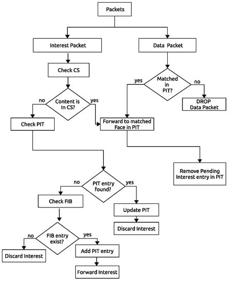 Lastly, the PIT checks to match entry for arrived data packets downstream of an NDN router. When a paired entry is obtained, the named content (data) is forwarded (transmitted) to face (interface), cached, and PIT discards the entry. Additionally, PIT has the capability of discarding/removing the data packet when signature verification is failed.