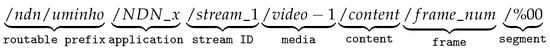The NDN name space is structured hierarchically, for instance, a video file may be produced by uminho ndn/uminho/stream-app/video-1, similar to the uniform resource locator (URL), with name components separated by ‘/’ in a readable address format.