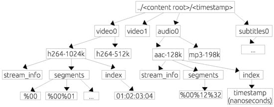 Figure 5 and Figure 6 illustrate a generic name hierarchy on NDN streaming applications. The large video content is split into video segments with their frame number. The NDN video and audio name components are presented by the following:
