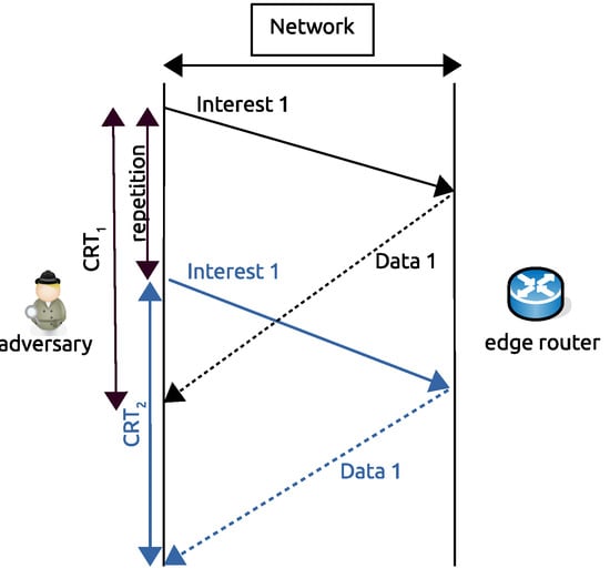CRT calculation was adapted from the TCP/IP RTT estimation []. Figure 7 illustrates the CRT calculation from the edge router to the adversary node. In this example, the adversary sends “Interest 1” and retrieves “Data 1”, and then repeats again the same “Interest 1”. Then, the adversary analyzes the obtained  and  values to conclude whether “Data 1” was cached or uncached from the edge router. The targeted “Data 1” is considered cached by the NDN edge router, if the adversary obtains , within a very small error tolerance (note that, it is possible to have this for uncached contents from the producer with short sequential requests).