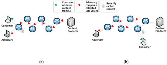Figure 8 illustrates two possible adversaries, based on CRT calculations. For instance, i. an adversary node can determine the target at the edge node (router) (Figure 8a), and ii. an adversary can determine the cached targets from away nodes (routers) (Figure 8b). Whenever the attack is completed to determine the locations, the attacker compares (or examines) each collected CRT metric (value), which may be used in three different main decisions for locations where the consumer’s target has been cached.