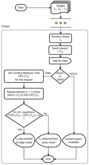 In this attack design, an adversary can repeat several attacks (depending on attack setup) to distinguish between uncached and cached targets. Each repetition presents various or matching CRT metrics to accomplish the attack decisions (e.g., the target is located or cached from the edge, neighbor, or away from locations/routers).