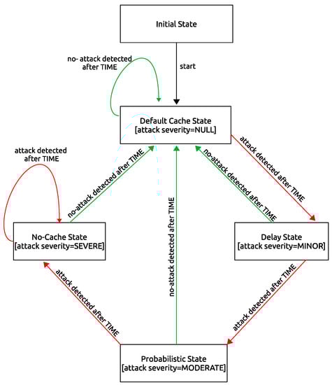 The attacks can be mitigated by certain approaches. A typical way is to add extra time to the cache-store response for the consumer(s). For instance, statically configured countermeasure methods (delay, randomized cache, and encryption) were discussed/proposed by works [,,,]. However, any additional delay or name encryption may disable (reduce availability of) the cache, which can be considered against in-networking caching-based NDN design.