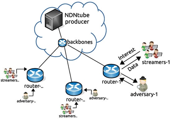 In the NDNtube simulation scenario, each of the streamed content (e.g., prerecorded video and live video) is produced by a single content producer. Each of the content is signed by the producer but it is not validated by a certificate authority. The consumers send packets (100 packets/s) at a constant rate to the content video producer. The producer virtual payload size is defined as 1024 bytes for streamed content. Note that, because NDNtube simulation is only simulated (ndnSIM) for attack and countermeasures, the audio and video decoding/encoding, compression formats (e.g., MPEG-2 and H.264) can be implemented by future studies.