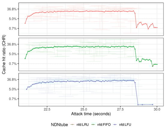 Figure 13 illustrates average CHR values (or metrics) that were obtained globally from all edge routers (gw-): ≈16.4% in nfd:LRU, ≈15.9% in nfd:FIFO, and ≈18.0% in nfd:LFU during the attack period (≈21–35 s). In these scenarios, the attack results showed that an adversary can succeed more in the least frequently used policy because it keeps the famous contents in CS compared to other cache policies. Note that the attack success may be variously determined by the quantity of adversary, targets, network topology, and CS policy.