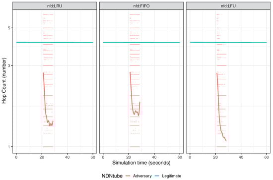 The hops between the NDN routers are identified by “hop counts”. During an attack, the hop count can be decreased and used to identify the adversary’s faces. Figure 14 illustrates the global hop counts for the adversary and legitimate node faces on NDNtube in LRU, FIFO, and LFU scenarios during the simulation time (0–60 s). In these results, the average, minimum, and maximum of hop counts were illustrated for the adversary and the legitimate faces, respectively. The following average hop counts were obtained: i. adversary faces, 1.40 in nfd:LRU, 1.95 in nfd:FIFO, and 1.52 in nfd:LFU. ii. legitimate faces, 3.72 in nfd:LRU, 4.15 in nfd:FIFO, and 4.15 in nfd:LFU.