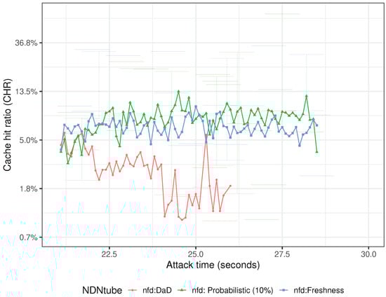 In NDNtube, the video segments can be also cached by the freshness period of the segment. Additionally to probabilistic caching (countermeasure to mitigate the attacks), the segments were configured by the freshness period (≈100 ms). On the other hand, the DaD threshold (CHR) is configured as 5% to detect the adversary, and the detection period is configured as 0.5 s and applies each attack phase (minor, moderate, and severe) for 3 s.