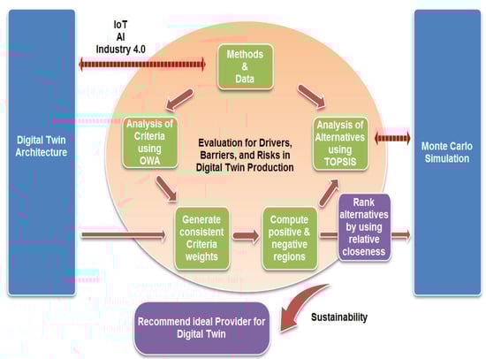 The model for the production of DTs is concerned with the DT architecture, evaluation methodology, and Monte Carlo Simulation, as mentioned in Figure 1. The DT architecture includes IoT technologies, AI, and Industry 4.0. The evaluation methodology is built on the drivers, risks, and barriers to DT architecture. The methodology includes methods and data in addition to an analysis of MCDM. Monte Carlo simulation is used to reflect the impact of decision-makers’ judgments as input with the outcomes. A detailed overview of the proposed model is in Figure 2.