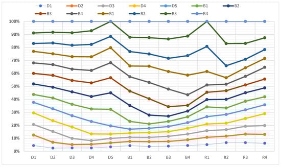 The graphical representation for aggregated decision-makers’ judgments is illustrated in Figure 3. For applying OWA, the weights were assumed as mentioned in Table 4 and represented in Figure 4. Then, the OWA general and aggregated decision-makers’ judgments were generated using Form (3) and Equation (4) and as mentioned in Table 5. Hence, the new and accurate weights calculated on the generated OWA decision-makers’ judgments and results are depicted in Table 6.