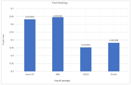 In order to aid the process of decision-makers in uncertain conditions, the case study adopts the application of TOPSIS on four different service providers for DT according to the final weights for criteria. The four alternatives are: (1) Azure Digital Twins; (2) IBM; (3) CISCO; and (4) Oracle. The judgments of decision-makers are collected in a triangular neutrosophic scale and converted into numerical values. The aggregated decision makers’ judgments of alternatives for criteria are aggregated using Equation (7) and as mentioned in Table 7. Apply the three steps for TOPSIS as follows: normalization is applied using Equation (9); results are depicted in Table 8. The positive and negative regions are applied using Equations (10) and (11), with the results presented in Table 8. Compute negative and positive regions using Equations (12) and (13) to achieve the relative closeness using Equation (14), as mentioned in Table 9. Figure 5 shows the final ranking as follows: IBM, Azure DT, oracle, and CISCO. The final rankings can aid decision-makers to achieve ideal DT providers to achieve sustainability with respect to the challenges of IoT, AI, and industry 4.0 technologies.