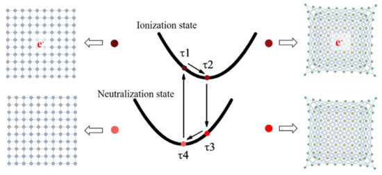 Two parallel chains with hopping conduction were assumed with discrete, separated distance, at which scale the interchain tunneling is negligible while the coulomb correlation works [20]. In the system of localized sites, polarons are the main quasi-particles carrying charges [31], which are formed by electrons (holes) dressed with deformed lattices. In systems with soft lattices such as organic semiconductors, the low-frequency phonon modes will lead to strong asynchronization between the electron and the lattice deformation. This is illustrated by the transition process in the configuration coordinate of Figure 1, where the ionization and neutralization of a site in carriers’ hopping could proceed in 4 steps [32], (1) the neutral site suddenly accepts an electron after a vertical transition, but the lattice is adiabatic at this moment, and the waiting time for this configuration before the lattice’s relaxation is assumed to be τ1; (2) the lattice relaxation occurs, and the ionized site reaches the new equilibrium configuration with duration time τ2; (3) the ionized site loses the electron in a vertical transition, leaving the deformed lattice for a period of time τ3; (4) the deformed lattice restores to the equilibrium position of the neutral site, lasting for a period of τ4 before accepting a new electron.