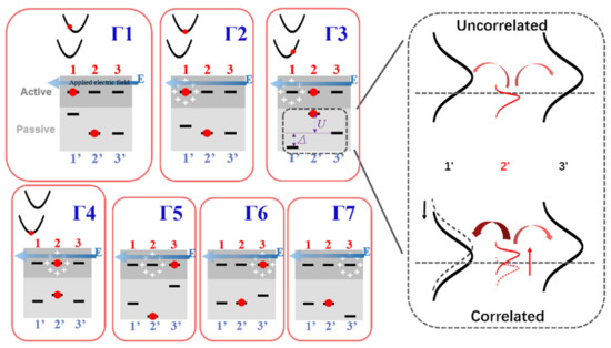An architecture with three adjacent sites in one dimension was used to demonstrate the calculated electron hopping process, as in Figure 2. Solid lines represent hopping sites, red circles represent electrons, and positive marks denote the cloud of deformed lattices. Spatially, the deformed lattice that acts as an effective positive charge will lag behind the electron. The dragging process could be divided into 7 sections, i.e., from Γ1 to Γ7. Among them, Γ1 to Γ4 relate to the 4 stages of τ1 to τ4 for site 1; Γ3 to Γ6 relate to the stages of τ1 to τ4 for site 2; while Γ5, Γ6, and Γ7 relate to the stages of τ1, τ2, and τ3 for site 3, all corresponding to the transitions process defined in Figure 1. Due to the motion of electrons and quasi-particles, energetic correlation effects will be triggered in the passive line in these 7 sections.