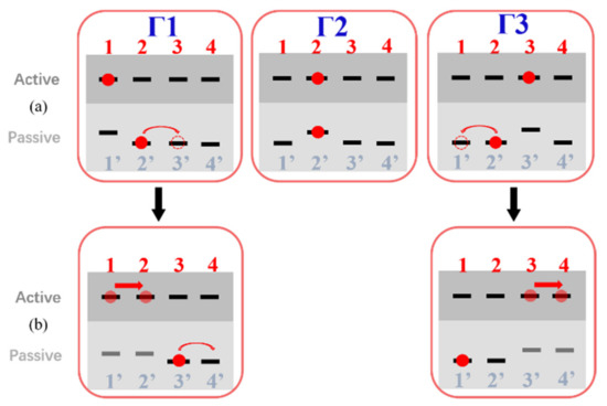 When it comes to a totally rigid lattice or a system with only high-frequency phonon modes, the lattice relaxation time is negligibly short, and lattice deformation and electron move together without any delay between them. When the lattice relaxation disappears, the original seven drag process in Figure 1 becomes three sections in Figure 3a. In such a situation, as shown in Figure 3a, we begin with a charge located at site 1 in the active line and a charge located at site 2′ in the passive line. In section Γ1, due to the coulombic correlations, the electron on site 1 would uplift the energy of the parallel site 1′, the carrier at site 2′ has a greater probability of hopping to site 3′ than to site 1′ as Formula (1). In section Γ2, the carrier at site 2′ has the same probability of hopping to site 3′ than to site 1′. In section Γ3, due to the coulombic correlations, the electron on site 3 would uplift the energy of the parallel site 3′, the carrier at site 2′ has a greater probability of hopping to site 1′ than to site 3′ as Formula (1), which is completely inverse to section Γ1. No macroscopic current is formed considering the whole electron transfer (sections Γ1, Γ2, and Γ3). However, when considering a secondary order case, as shown in Figure 3b, the forward hopping charge has some possibility of being further driven forward by the same charge in the active line again. In contrast, the same charge would no longer drive the backward hopping charge. The hopping frequency of positive drag can only be -described as