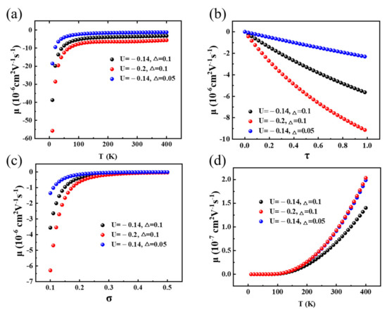 As shown in Figure 4a, the dependency of the negative drag mobility on the temperature T, the correlation strength from electrons (expressed by parameter U), and deformed lattices (expressed by parameter Δ) are displayed. The negative drag mobility decreases with the increase of temperature, showing decreased correlation effect when thermal activation weakens the system disorders’ influence. In addition, both the correlations from the electrons (noted as U) and lattices (noted as Δ) correlation strength could effectively determine the strength of the drag effect, shown in Figure 4a. In the Miller-Abrahams hopping framework, the energy difference determines the hopping rate, as shown in Equation (1). The effect of the parameters U and Δ on the negative coulomb drag hopping rate show the fundamental roles of their interactions in the negative drag process.