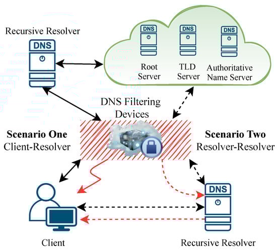 Generally, DNS filtering is an on-path DNS hijacking method that can passively observe every DNS query request “passing through” its devices [4]. At the same time, it can directly return forged response packets to the DNS resolvers or clients [18]. Suppose the DNS resolver is not configured with DNSSEC (Domain Name System Security Extensions) validation. In that case, it will usually accept the forged response IP because it is earlier than the correct response IP. Therefore, access to the block-listed domain name will be blocked or redirected. From a high perspective, based on the location of the DNS filtering device, DNS filtering scenarios can be classified into two categories: Client-Resolver and Resolver-Resolver, as shown in Figure 1 (Solid and dotted red lines).
