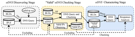 As shown in Figure 2, the open DNS resolvers discovering stage is responsible for sending A and AAAA records query for two well-selected domains to the specific IPv4 address space and collecting responses from target IP addresses. These two domain names are composed of a random blocked domain and a purpose-registered domain name that we control.